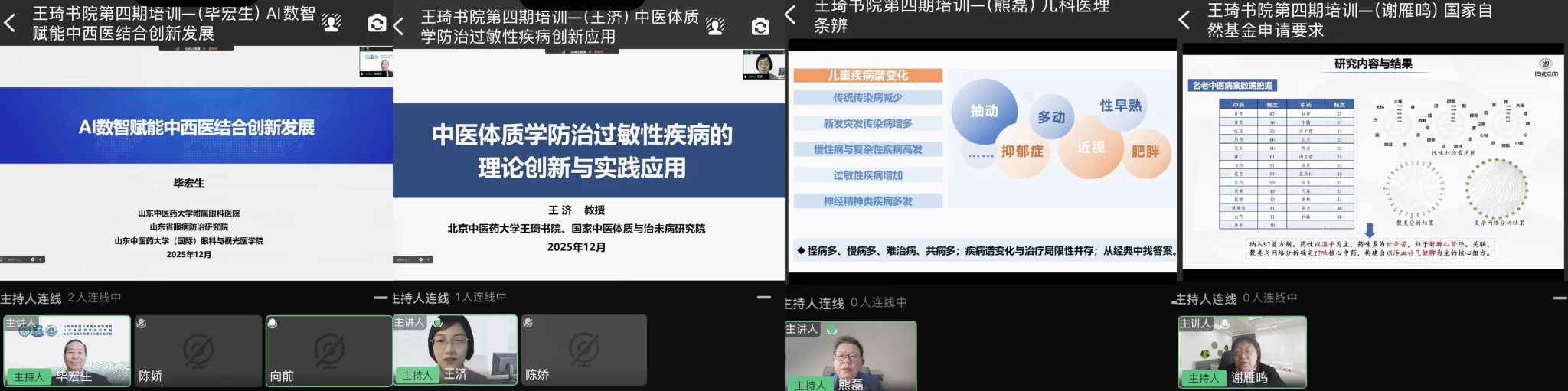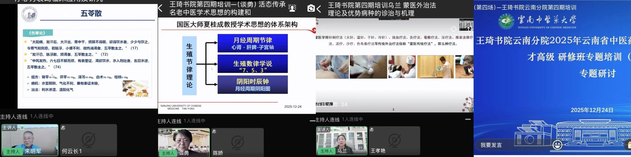 2025年12月15日-19日、22日-26日,王琦书院云南分院举办“2025年云南省中医药(民族医药)尖端人才高级研修班(第四期)”专题培训。本次培训以“精研究·融交叉·促传承”为主题,通过“线上授课+专题研讨”的混合教学模式开展。