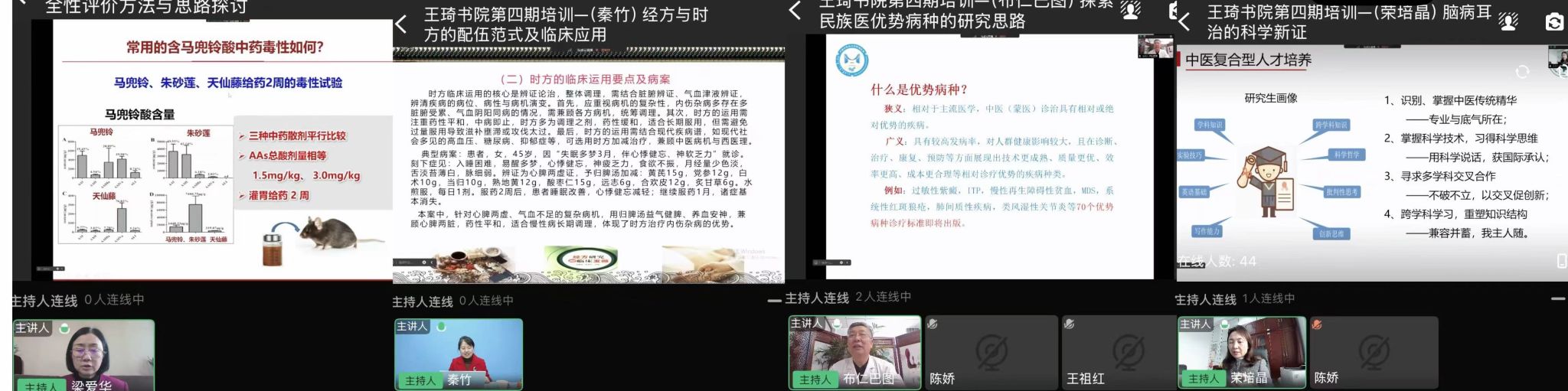 培训期间,云南省中医药(民族医药)尖端人才高级研修班的学员们与授课专家围绕中医药、民族医药的传承创新发展和学科交叉开展了多场专题研讨。本期培训吸引了300余名来自全省各级中医医疗机构的医务人员、云南中医药大学开办的“西学中”培训班学员和学校广大师生进行线上旁听学习。