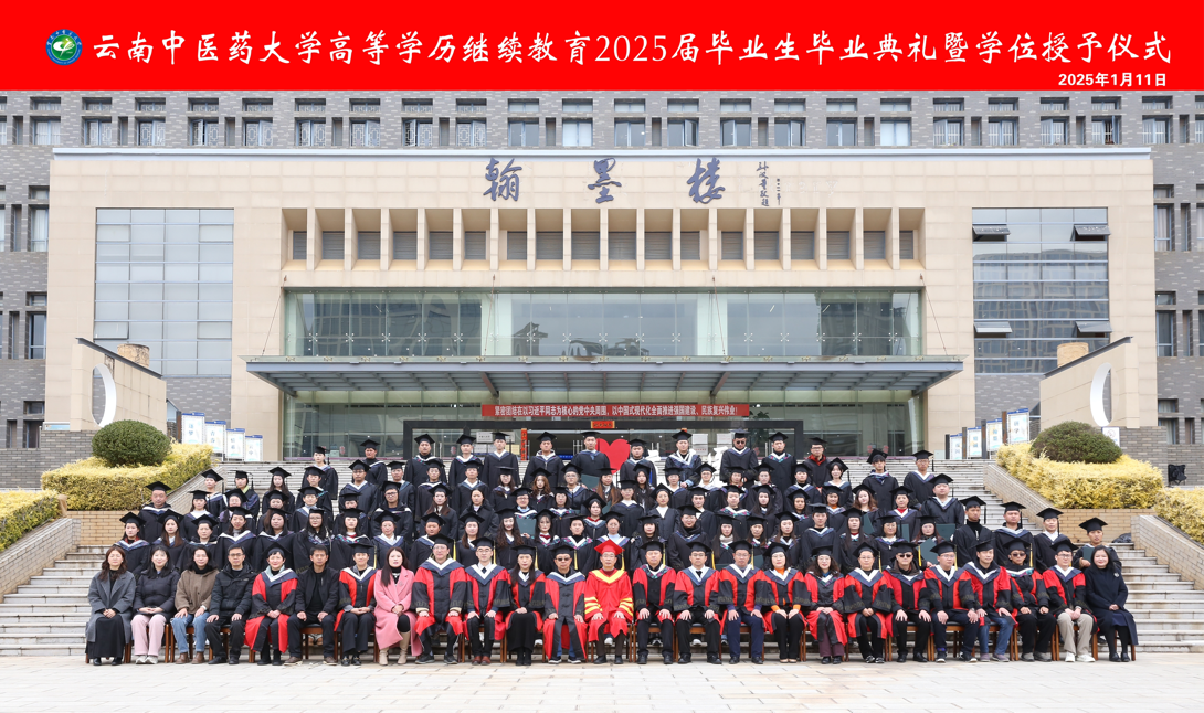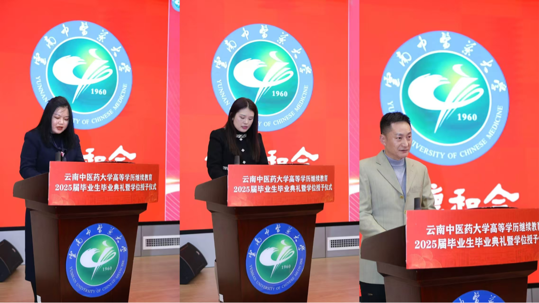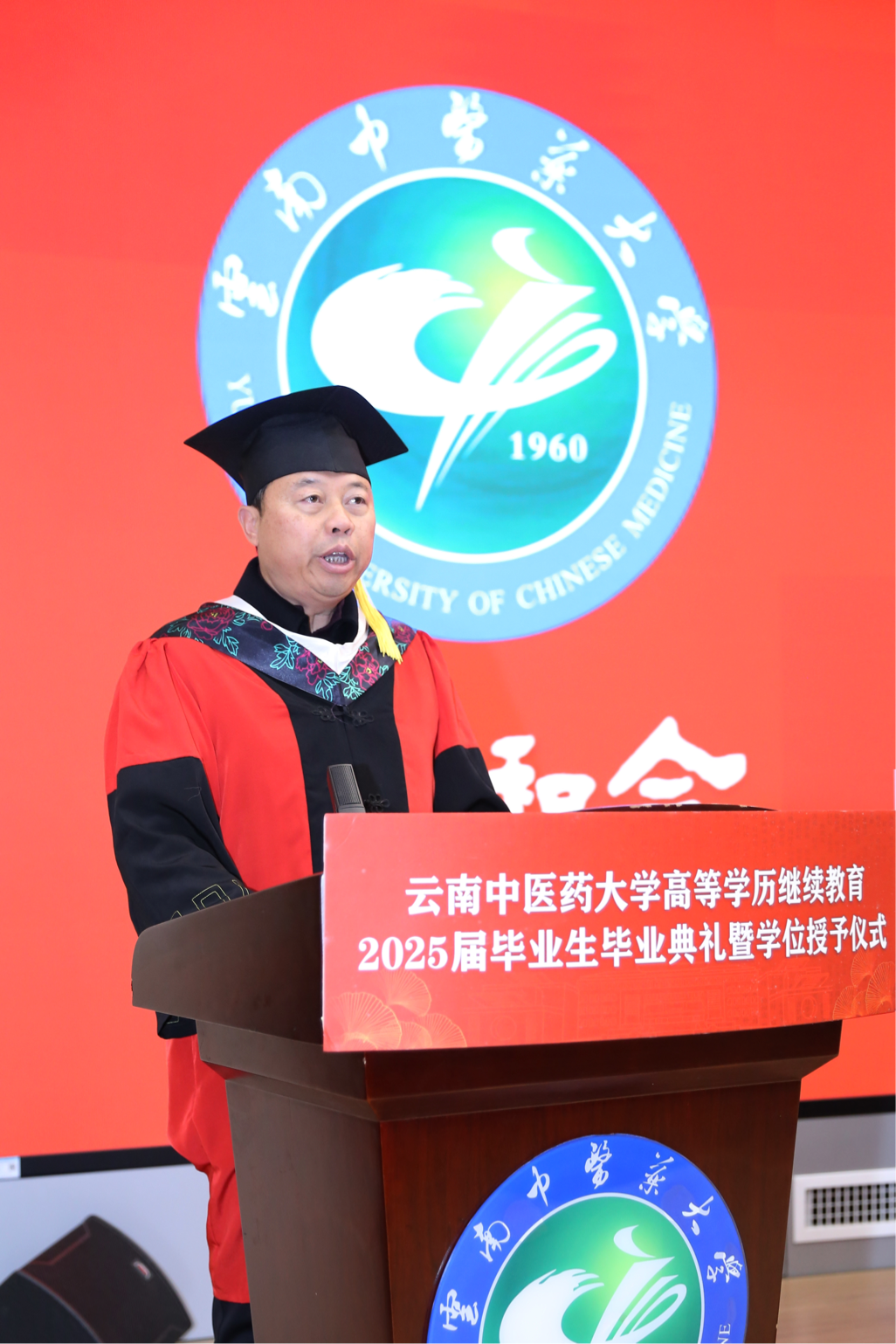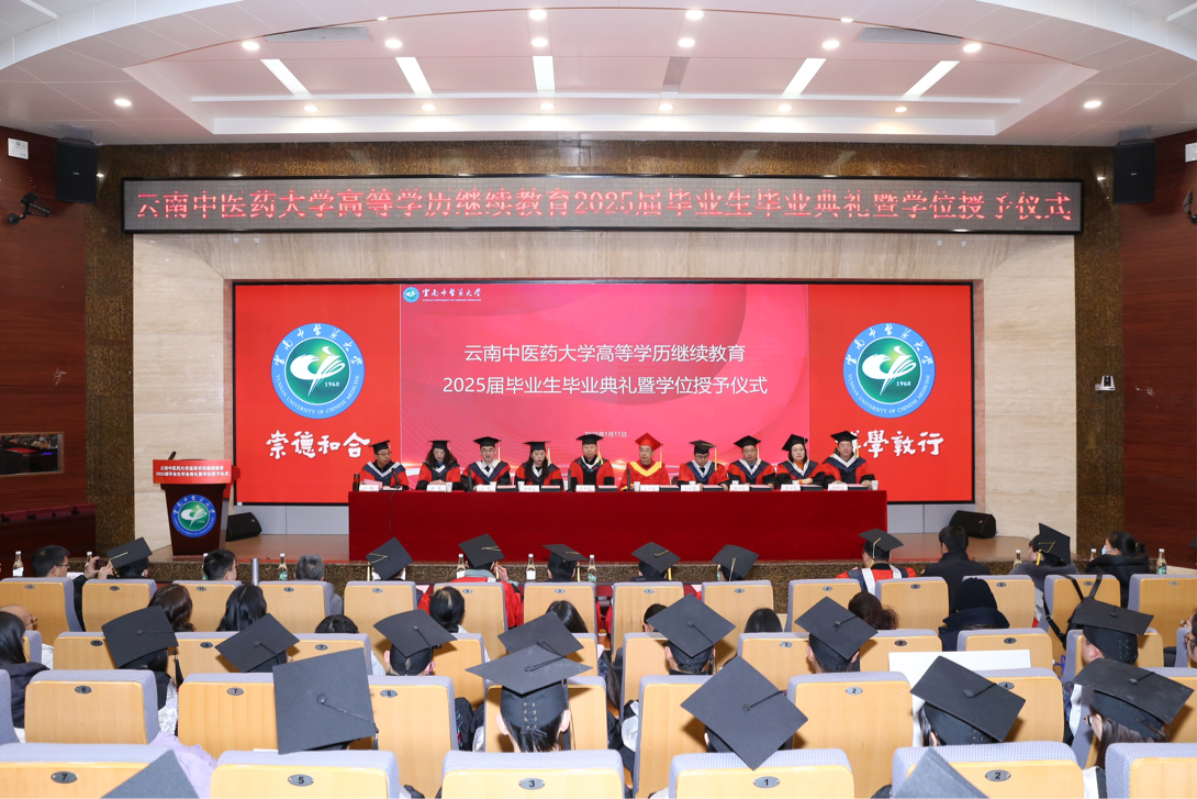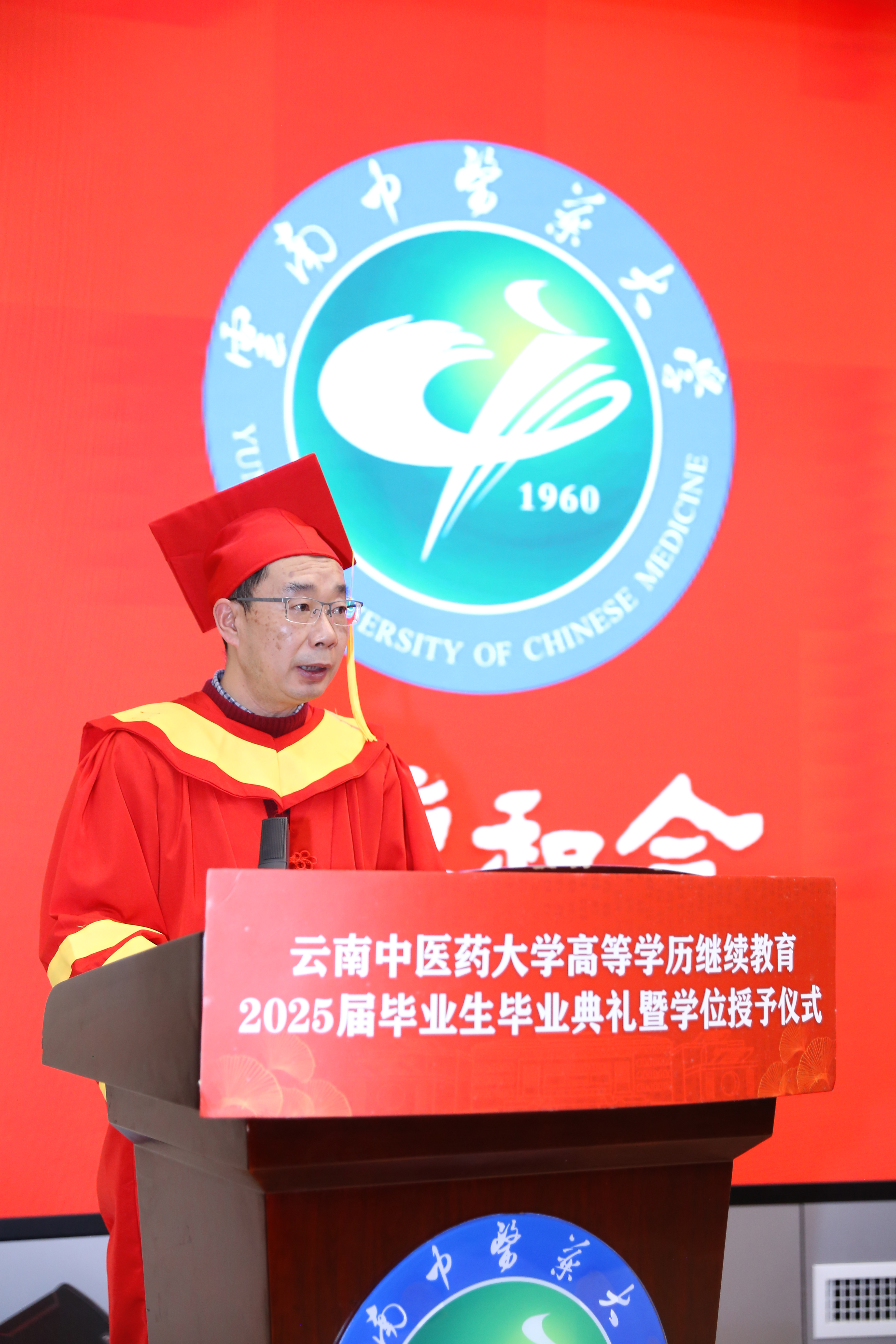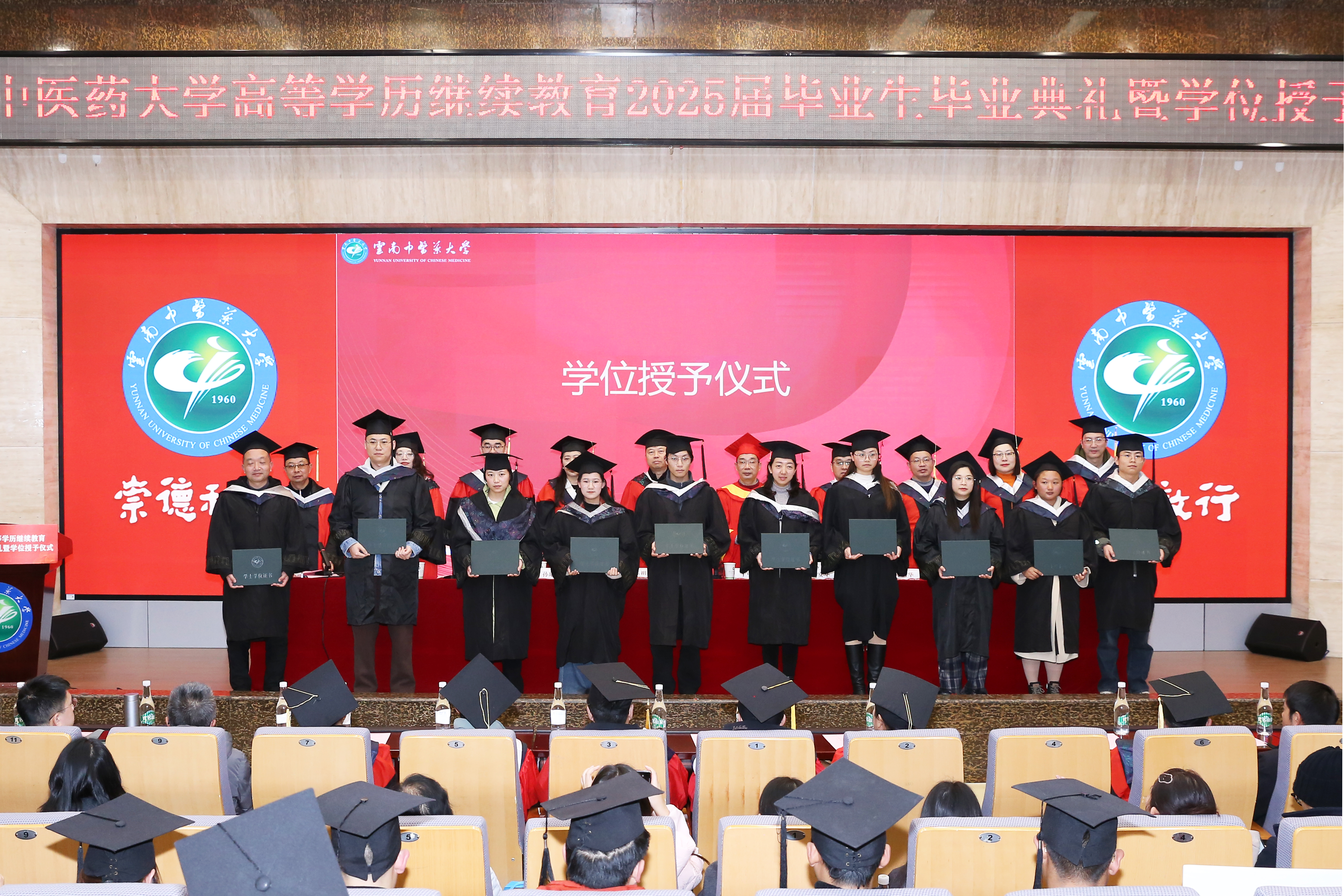 云中讯(继续教育学院) 1月11日下午,云南中医药大学高等学历继续教育2025届毕业生毕业典礼暨学位授予仪式在呈贡校区举行。学校16家校外教学点负责人和教学管理人员、2025届毕业生代表共200余人现场参加典礼。云南中医药大学校长、校学位评定委员会主席丁中涛,副校长、校学位评定委员会副主席陈祖琨、学校高等学历继续教育各专业承办二级学院主要领导出席典礼。